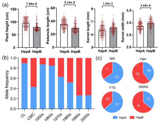 此外,多环境的田间表型数据表明QTrl.Rs-5B的优势单倍型QTrl.Rs-5BHapB可改良小麦株型和产量性状,其频率在现代小麦栽培种中上升,具有较大的育种应用潜力(图3)。