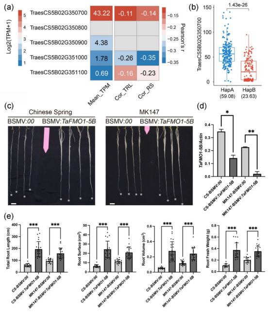 (a) QTrl.Rs-5B区间内基因表达量与表型相关性。(b) QTrl.Rs-5B单倍型间TaFMO1-5B表达量差异。(c) TaFMO1-5B基因表达沉默(BSMV-VIGS)后的根系表型。(d) TaFMO1-5B基因表达量。(e) TaFMO1-5B基因表达沉默(BSMV-VIGS)后的根系表型统计值。