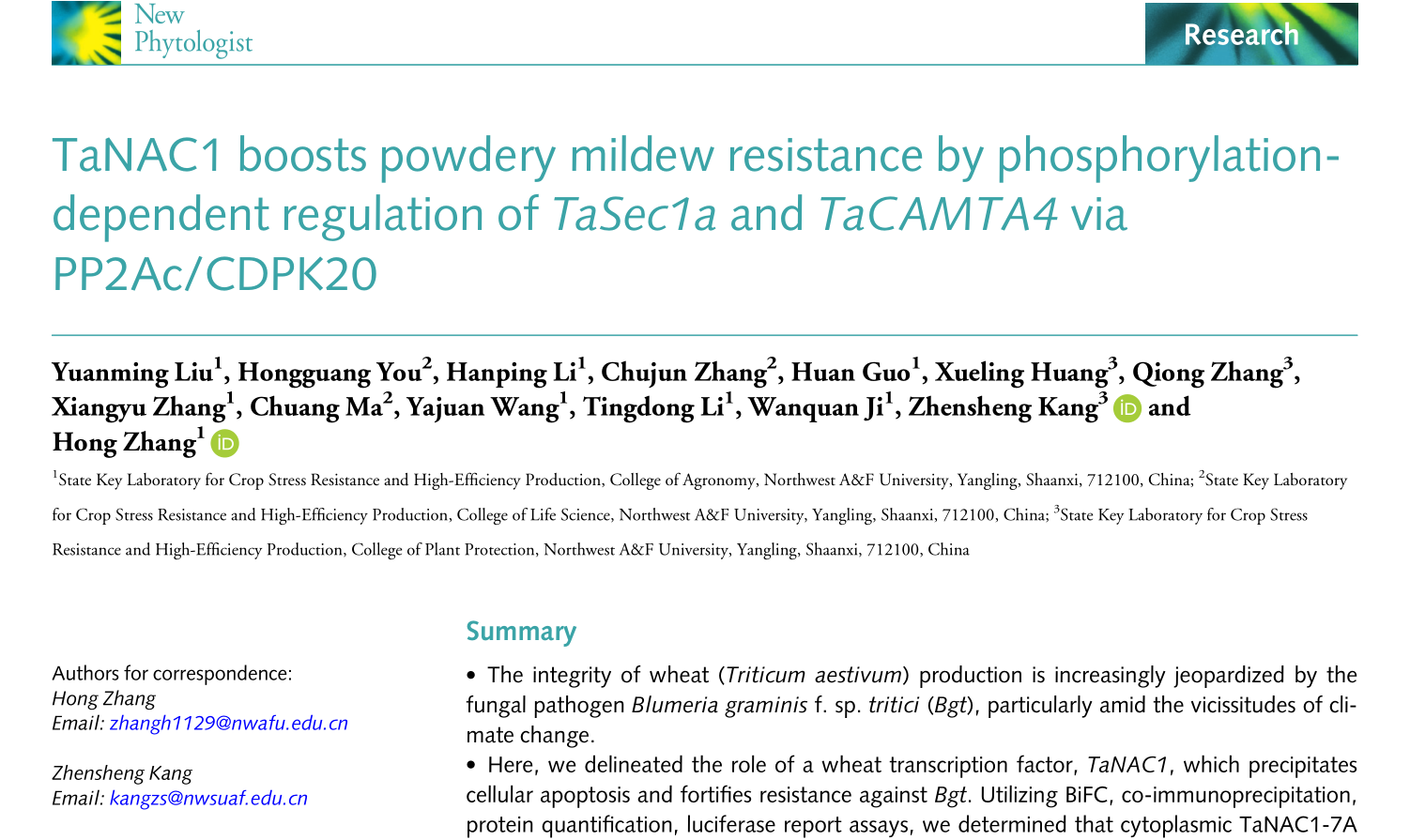 近日,张宏研究员团队在《New Phytologist》发表题为“TaNAC1 boosts powdery mildew resistance by phosphorylation-dependent regulation of TaSec1a and TaCAMTA4 via PP2Ac/CDPK20”的研究论文,该研究以多组学数据分析挖掘到的小麦转录因子TaNAC1为切入点,揭示了其在小麦抗白粉病中的遗传基础和作用机制;解析了该基因亚基因组同源基因的功能性遗传差异,并阐明了其调控细胞凋亡和增强抗病性的作用机理。农公司博士研究生刘圆明为论文第一作者,张宏研究员和康振生教授为论文通讯作者。