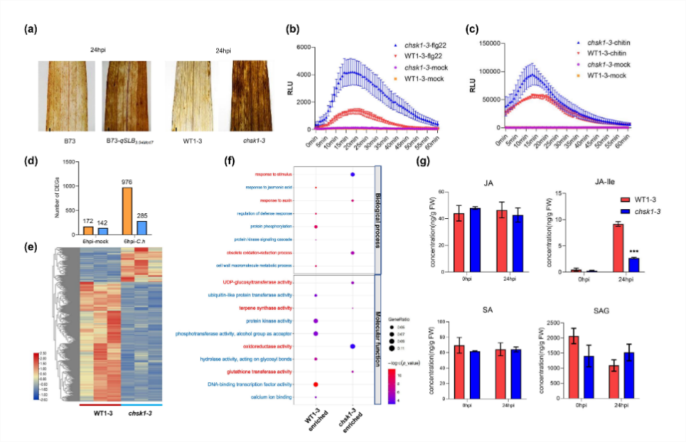 玉米突变体、CRISPR/Cas9基因编辑材料分析表明,ChSK1突变或敲除可以显著增强玉米对小斑病的抗性。活性氧检测及转录组分析发现,ChSK1可能通过抑制基础免疫反应增加植物感病性(图2)。综上所述,该研究表明ChSK1是玉米小斑病的感病基因,可能通过抑制基础免疫来增强寄主的感病程度。这项研究揭示了LRR-RK基因可引起植物感病,增加了研究人员对植物感病的理解,也为培育玉米小斑病持久抗病性品种提供了新的思路。