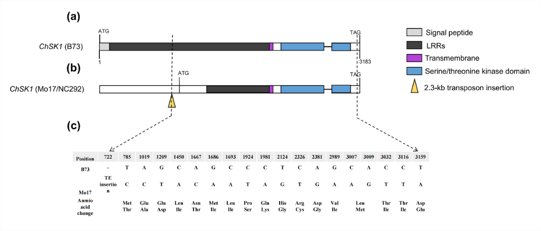玉米对小斑病的抗性是由多基因控制的复杂数量性状。前期研究发现,位于第3号染色体bin3.04的QTL- qSLB3.04是一个玉米小斑病的隐性抗病位点。该研究利用图位克隆、候选基因关联分析、表达分析等发现ChSK1是qSLB3.04位点的感病基因,其编码一个LRR-RK蛋白。抗病亲本Mo17和NC292在ChSK1的第一个外显子上存在一个2344-bp的Harbinger-like转座子插入,导致基因失活(图1)。玉米NAM群体ChSK1等位基因分析发现,抗病材料中存在更多的变异类型,但不包含转座子插入,暗示不同抗病等位基因可能存在独立的进化模式。