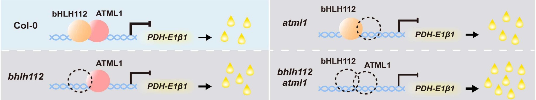 种子油脂积累是由多因素、多层次网络协同调控的复杂生物学过程,转录因子在其中扮演着关键角色。目前,关于转录因子如何调控种子油脂积累的分子机制及其调控网络,仍有诸多未知亟待探索。本研究发现,转录因子bHLH112与ATML1均在种子脂肪酸合成的关键时期丰富表达,并对油脂积累发挥负向调控作用。进一步分析显示,bHLH112与ATML1在蛋白水平上存在相互作用,二者协同抑制脂肪酸合成关键基因PDH-E1β1的表达。后续遗传学试验证实,bHLH112与ATML1以加和效应共同抑制种子中的油脂积累。综合上述结果,本研究提出了bHLH112与ATML1协同调控种子油脂积累的分子模型,扩展了油脂积累的调控网络,为油菜等油料作物的高油分子育种提供理论依据与基因资源。