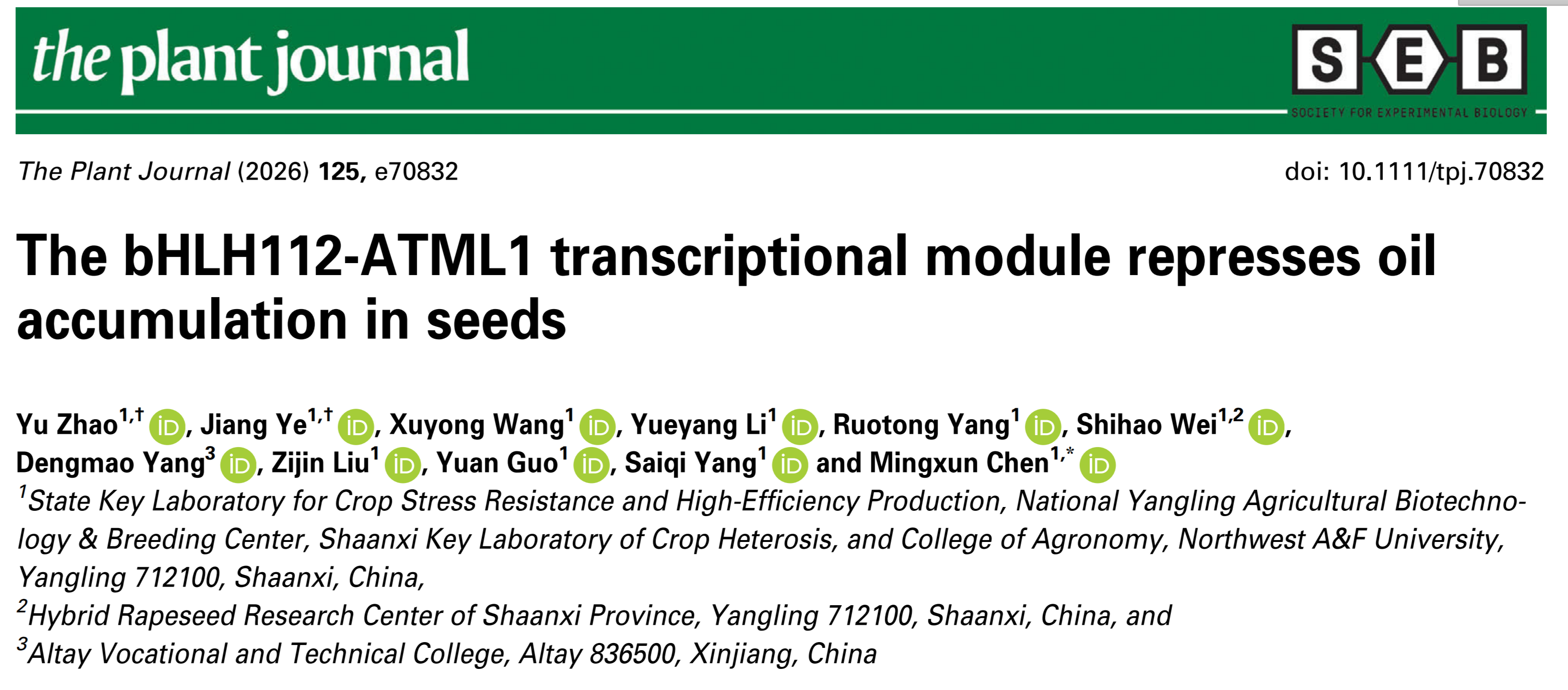 近日,陈明训教授团队在《The Plant Journal》期刊发表题为“The bHLH112-ATML1 transcriptional module represses oil accumulation in seeds”的研究论文。该研究揭示了bHLH转录因子bHLH112与HD-Zip转录因子ATML1协同调控种子油脂积累的分子机制,深化了人们对种子油脂积累调控网络的理解,并为油菜等油料作物种子含油量的提升提供了新的作用靶点。