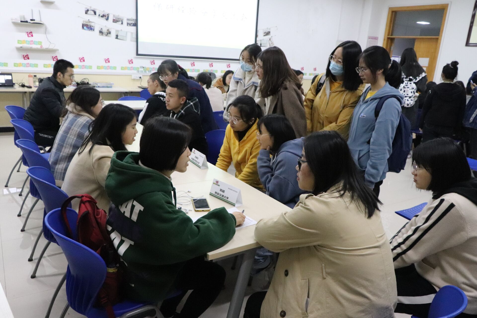 在随后的一对一交流环节,17位保研员工代表与低年级同学们面对面交流,为大家答疑解惑。保研同学结合自身实际经历,介绍了保研的相关政策、各阶段的准备工作、学习方法和经验等,对选择院校、专业方向、导师及如何准备面试、笔试提出了一系列宝贵的建议。