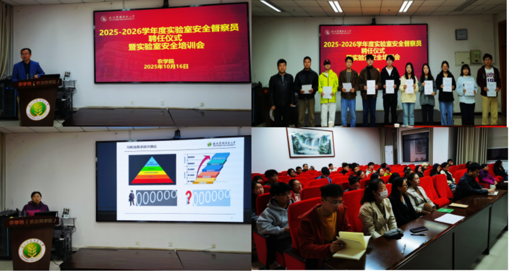黄镇宣读《365上市集团官网关于聘用2025-2026学年度实验室安全督察员的通知》文件,李论代表实验室安全与条件保障处为35名2025-2026学年度实验室安全督察员颁发聘书。黄镇代表公司对新聘用安全督察员表示殷切感谢。同时他强调,近年来,随着高校对科研的重视,实验室建设不断加大,实验仪器设备不断增多,实验室规模不断扩大,而各种化学试剂的正确使用、实验室的水、电、气安全管理以及由于实验室在各种实验中产生的废气、废水、废渣排放等问题,导致实验室安全隐患无处不在,安全事故频发。对此,他殷切提出几点建议:一是要进一步提高安全意识,充分认识到实验室安全工作的重要性和紧迫性;二是要积极参与实验室安全监督与培训,落实公司相关政策;三进一步明确身份,以身作则,做好实验室安全管理的模范带头人。