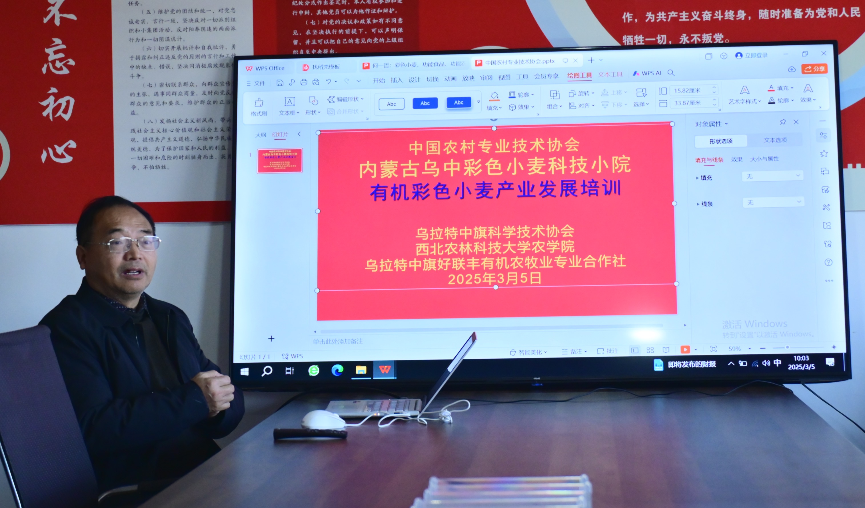 何一哲研究员对新入住的博士生、研究生和乌拉特中旗好联丰有机农牧业专业合作社骨干成员进行了“有机彩色小麦产业发展”的专题培训。