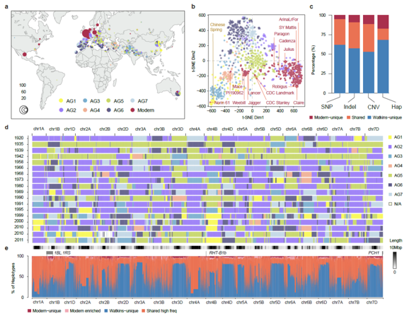 该研究引进了英国约翰·英纳斯中心保藏的百年前收集的来自世界三十多个国家的全套小麦种质资源(827份A.E. Watkins小麦地方品种和220份全球现代品种),开展了小麦群体遗传学系统分析、基因资源挖掘和种质创新工作。研究发现,现代小麦品种的遗传多样性下降了67%,而Watkins小麦未经现代育种程序的大规模筛选,因而保留了许多未被育种应用的遗传变异,结合137个农艺性状的表型鉴定数据,鉴定了一大批具有广阔应用前景的优异等位基因和单倍型,并通过杂交、回交的方式导入现代品种,形成了700多个单片段替换系,验证和利用了Watkins小麦在产量、抗病、营养等性状上对于现代小麦育种的巨大利用价值,为未来精准智能育种奠定了基础。