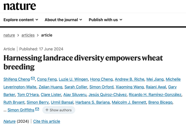 6月17日,公司小麦非生物胁迫机理研究团队王晓明副教授参与的一项题为“Harnessing Landrace Diversity Empowers Wheat Breeding”的研究在Nature在线发表。该研究由中国农业科公司深圳农业基因组研究所联合英国约翰·英纳斯中心(John Innes Centre)等国内外多家优势单位共同完成,公司为联合署名单位。