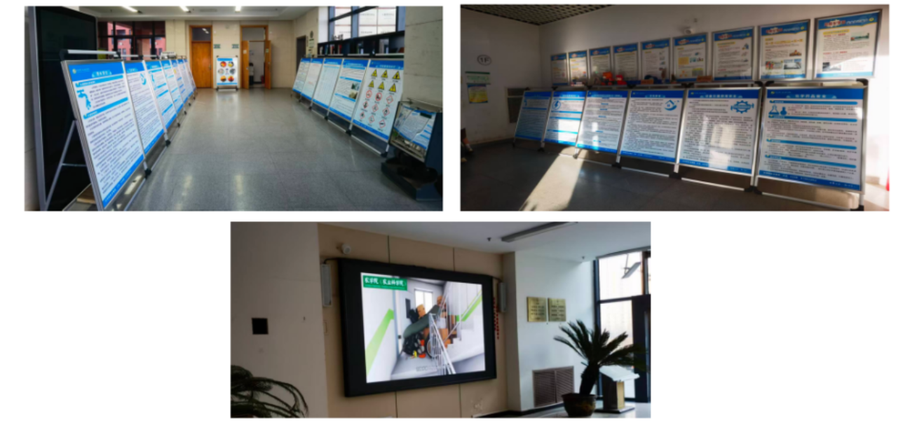 公司充分利用一楼西侧电子屏,循环播放实验室安全相关视频,以生动影像传递安全知识。同时,在电梯东西出入口等人流密集区域布置安全教育展板,内容涵盖制度规范、用电用水、化学品管理、消防警示及典型事故案例等,利用师生候梯间隙进行碎片化学习,实现安全提醒“抬眼可见、驻足即学”。