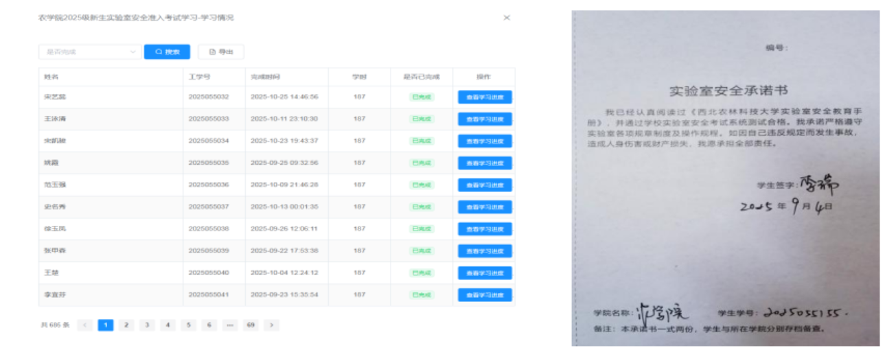 面向2025级全体本科及研究生新生,公司实施“安全教育第一课”计划。入学之初,每位新生均获发《实验室安全教育手册》,并签署《实验室安全承诺书》,从源头树立安全责任意识。2025年9月至10月,组织新生通过公司“实验室安全智慧化管控系统”完成不少于4学时的线上学习,并参与安全准入考试,共有655人顺利通过,筑牢了安全科研的第一道防线。
