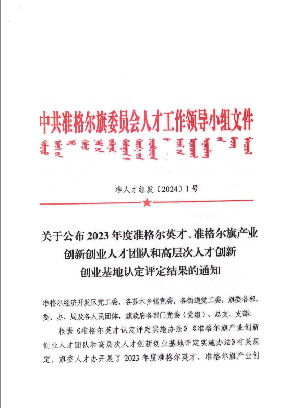 近日,根据《准格尔英才认定评定实施办法》《准格尔旗产业创新创业人才团队和高层次人才创新创业基地评定管理办法》等有关规定,经单位审核推荐、实地考察、资格复审、专家评审、旗委人才工作领导小组审定,公司内蒙古准格尔杂粮科技小院荣获“产业创新创业人才研究团队”称号。