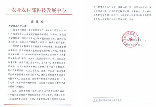 近日,农业农村部科技发展中心向公司发来感谢信,对公司陈亮副教授借调至农业农村部科技发展中心转基因生物安全管理处一年来开展的工作予以充分肯定,并表示了衷心感谢。
