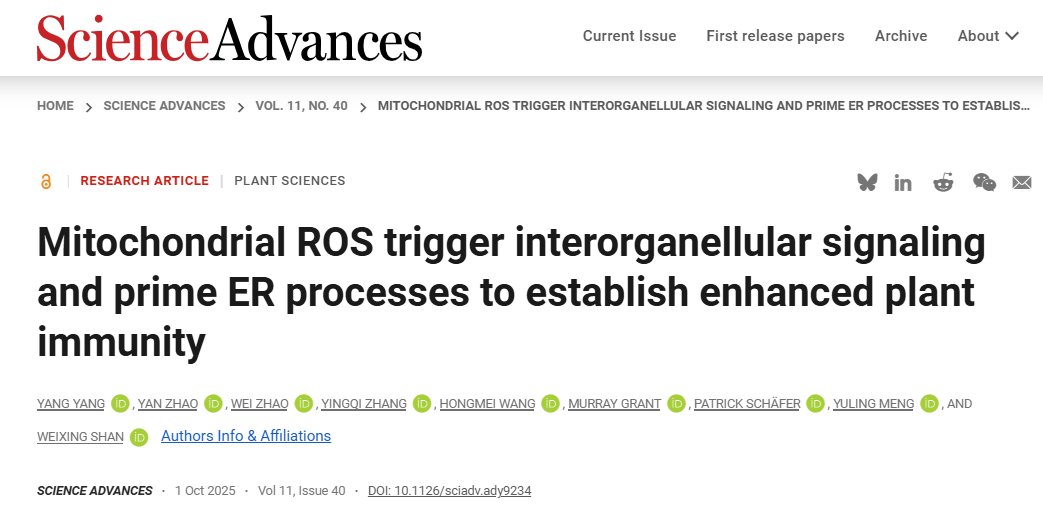 近日,单卫星教授课题组在学术期刊Science Advances发表题为Mitochondrial ROS trigger inter-organellular signaling and prime ER processes to establish enhanced plant immunity的研究论文,揭示了一条独立于质外体ROS与叶绿体ROS的ROS免疫信号通路:发现线粒体产生的mROS是植物响应病菌侵染的早期信号分子,通过促进线粒体—内质网互作转运至内质网,进而激发植物内质网应激反应及其介导的植物免疫激活的新机制。