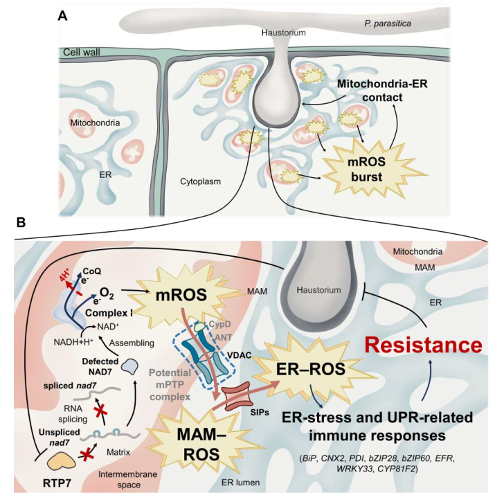 活性氧(ROS)是植物发育与抗病过程中的关键信号分子,目前对于植物免疫中ROS的研究主要聚焦于质外体ROS和叶绿体ROS。线粒体作为植物体内产生ROS的重要来源之一,线粒体活性氧(mROS)在植物信号传导与免疫中的作用已有初步研究,但目前对mROS激活植物免疫的信号通路和作用机制的认识十分有限。