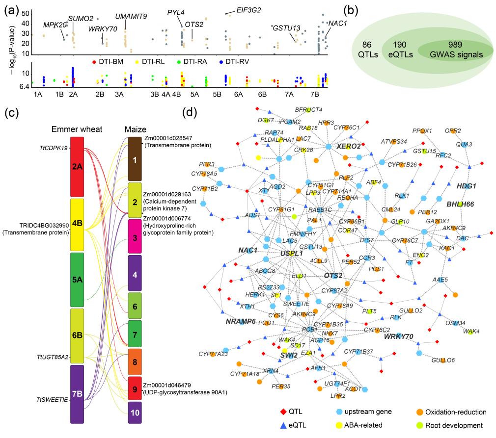 近日,365上市集团官网宋卫宁/聂小军课题组在国际学术期刊《New Phytologist》上发表了题为“Combined GWAS and eGWAS reveals the genetic basis underlying drought tolerance in emmer wheat (Triticum turgidum L.)”的研究论文。该研究通过利用GWAS、eGWAS以及共表达网络等方法,构建了四倍体小麦响应干旱胁迫的调控网络,鉴定了抗旱性相关候选基因及关键响应模块,为丰富小麦抗旱基因资源和遗传基础提供了重要信息。