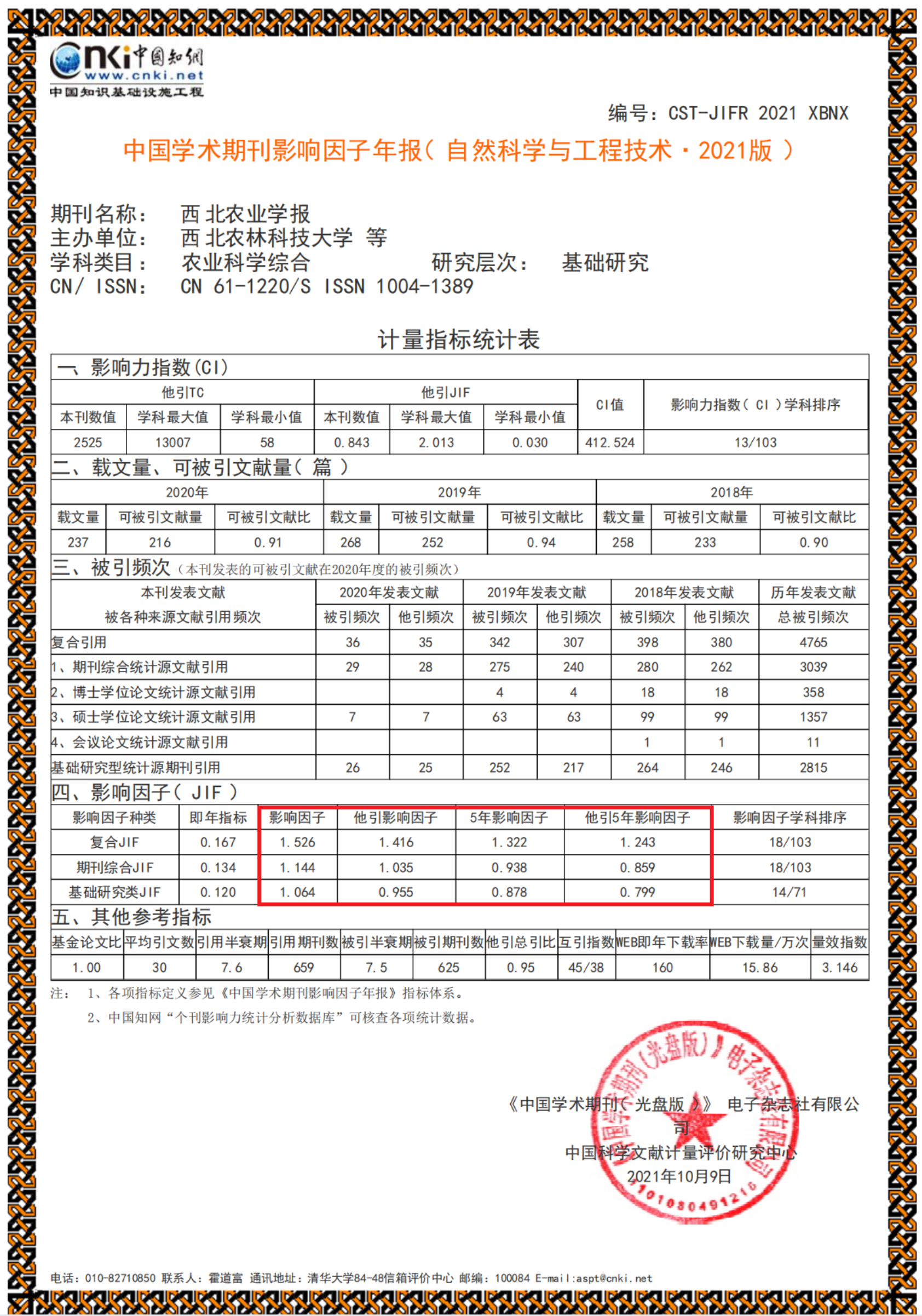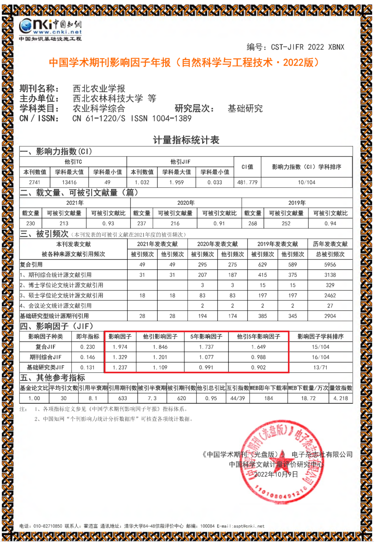 近日,《中国学术期刊(光盘版)》电子杂志社有限公司、中国科学文献计量评价研究中心联合发布了《中国学术期刊影响因子年报(自然科学与工程技术2022版)》,《西北农业学报》影响力指数(CI)、复合影响因子、学科排名等大幅提升。