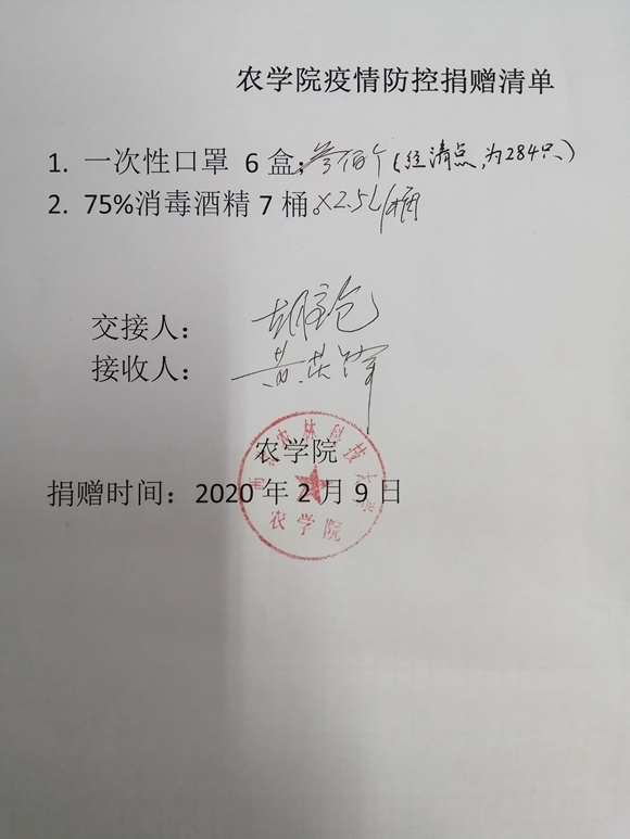 2月9日,胡宝仓副经理代表公司将公司各实验室、课题组无偿提供的一次性口罩6盒共计284只,75%消毒酒精2.5L/桶7桶移交给公司国资处。国资处副处长黄英锋代表公司接收了相应物资并及时将防疫相关物资转交到校医院抗疫防控第一线。这是公司师生为抗击新型冠状病毒疫情防控的第一批物资。