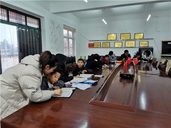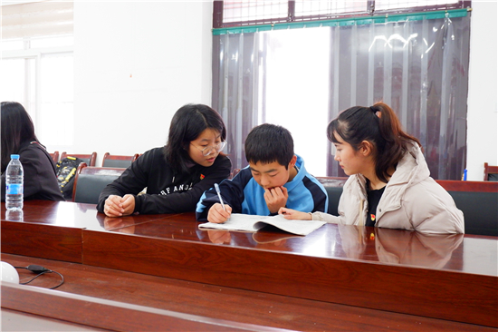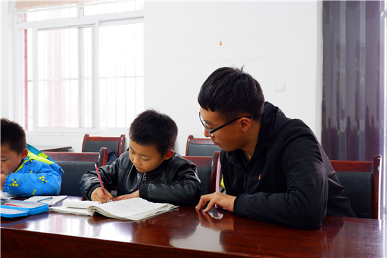 同学们到达村委会后,第一时间走入村户,邀请孩子们一起学习。孩子们陆陆续续地带着自己的作业来到村委会,同学们根据自己的优势学科进行分配辅导,对于不同层次、不同年级、不同需求的孩子,进行一对一的辅导,彭菲、李晨晨、李笑笑同学讲解语文,刘政德、刘睿佳、张晓雨同学讲解数学。